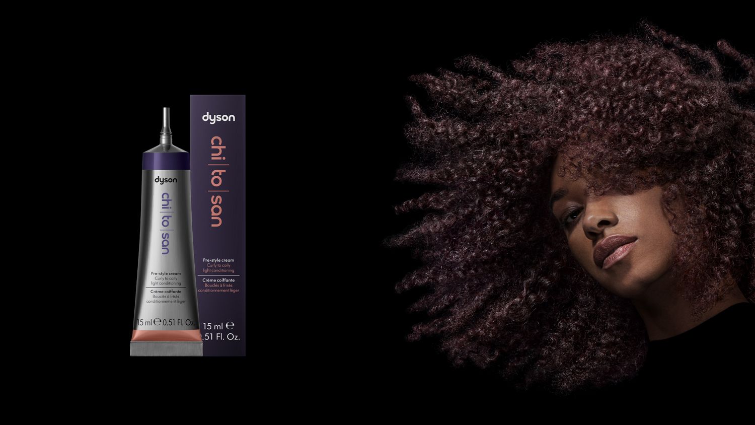 Model uses Pre-style cream Curly to coily light conditioning on her naturally curly hair. Styled with Dyson Airwrap™ multi-styler with Large volumising brush. Finished with Dyson Chitosan™ Post-style serum.
