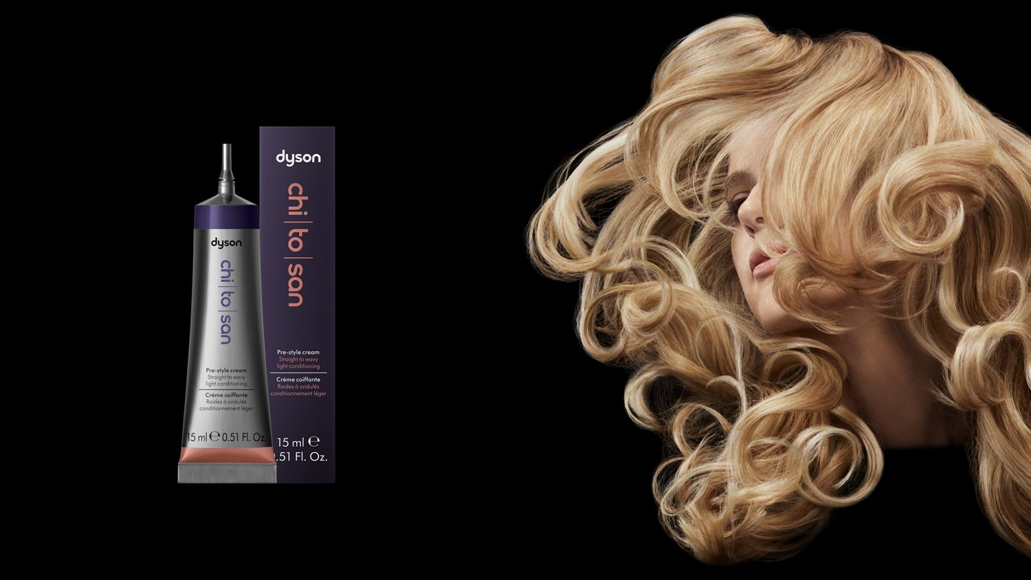 Dyson Chitosan™ Pre-style cream Straight to wavy light conditioning is developed for hair that’s naturally straight, slightly wavy, or has defined S-wave shapes. With a lightweight blend of conditioning agents, including grapeseed and argan oils, it is best suited to thinner hair strands that are easily weighed down by product.