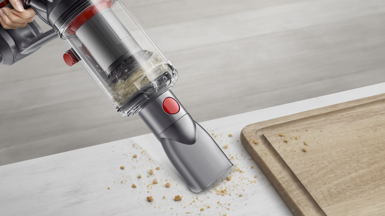 The lightweight Dyson V8™ vacuum is accoustically controlled to reduce noisy turbulence.