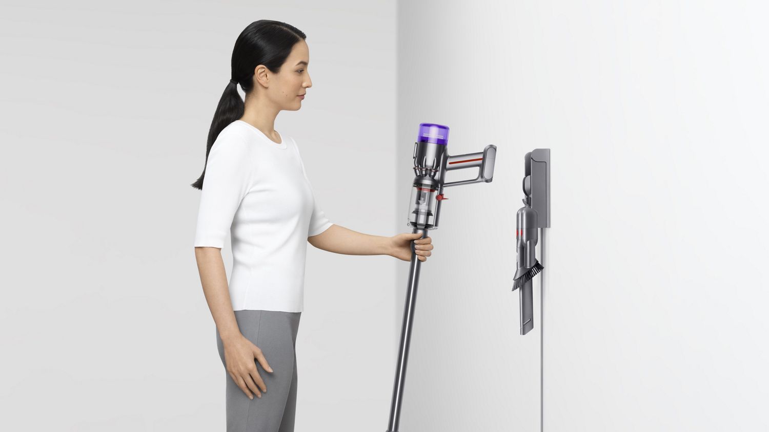 Always handy on the wall-mounted charging dock, your Dyson V8™ vacuum is easy to store – and ready to go when you need it.