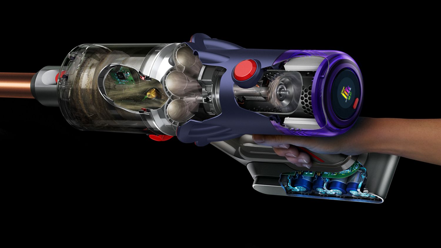 11 root cyclones generate centrifugal forces of up to 100,000g to capture dust and debris from the airflow, so there’s no loss of suction.²