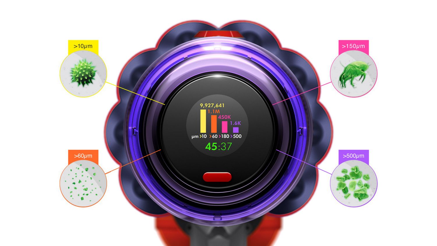 Dyson’s fully-sealed filtration traps 99.99% of microscopic particles and allergens as small as 0.3 microns – and expels cleaner air.⁴