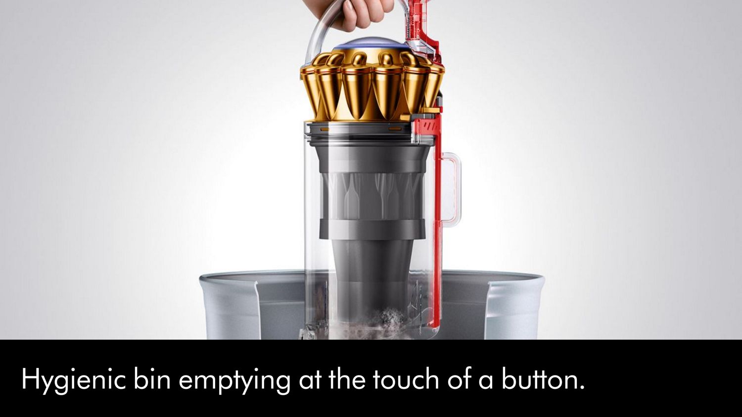 Unplug the vacuum and detach the bin by pressing the release button. Hold the bin over your rubbish bin and press the red button to release the bottom lid and empty the contents.
