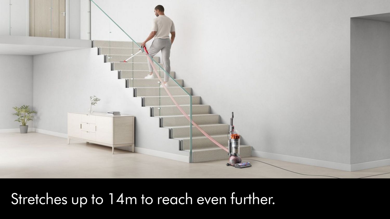14m of hose stretch for cleaning stairs. Up to 10m of extra-long cord reaches even further.